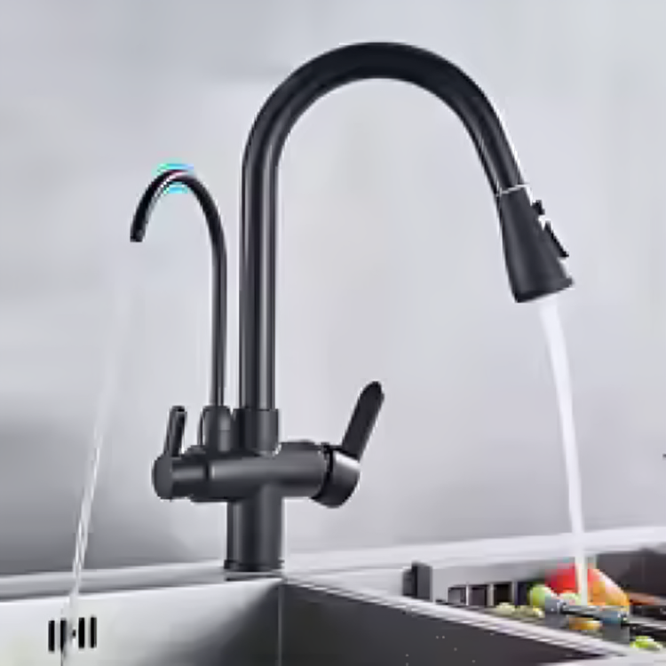 La fonctionnalité intelligente rencontre le design intemporel. Ce robinet à double poignée dispose de commandes indépendantes d'eau chaude et froide pour un mélange de température précis, associées à une tête de pulvérisation rétractable innovante équipée de LED qui s'illumine en fonction de la température de l'eau—bleu pour le froid, changeant à mesure qu'elle se réchauffe. La finition noir mat offre une toile de fond sophistiquée pour tout style de cuisine, tandis que le bec pivotant à 360° et la tête rétractable flexible rendent chaque tâche de cuisine sans effort. Les poignées séparées signifient un contrôle plus facile, une meilleure précision et un look classique qui ne se démode jamais.